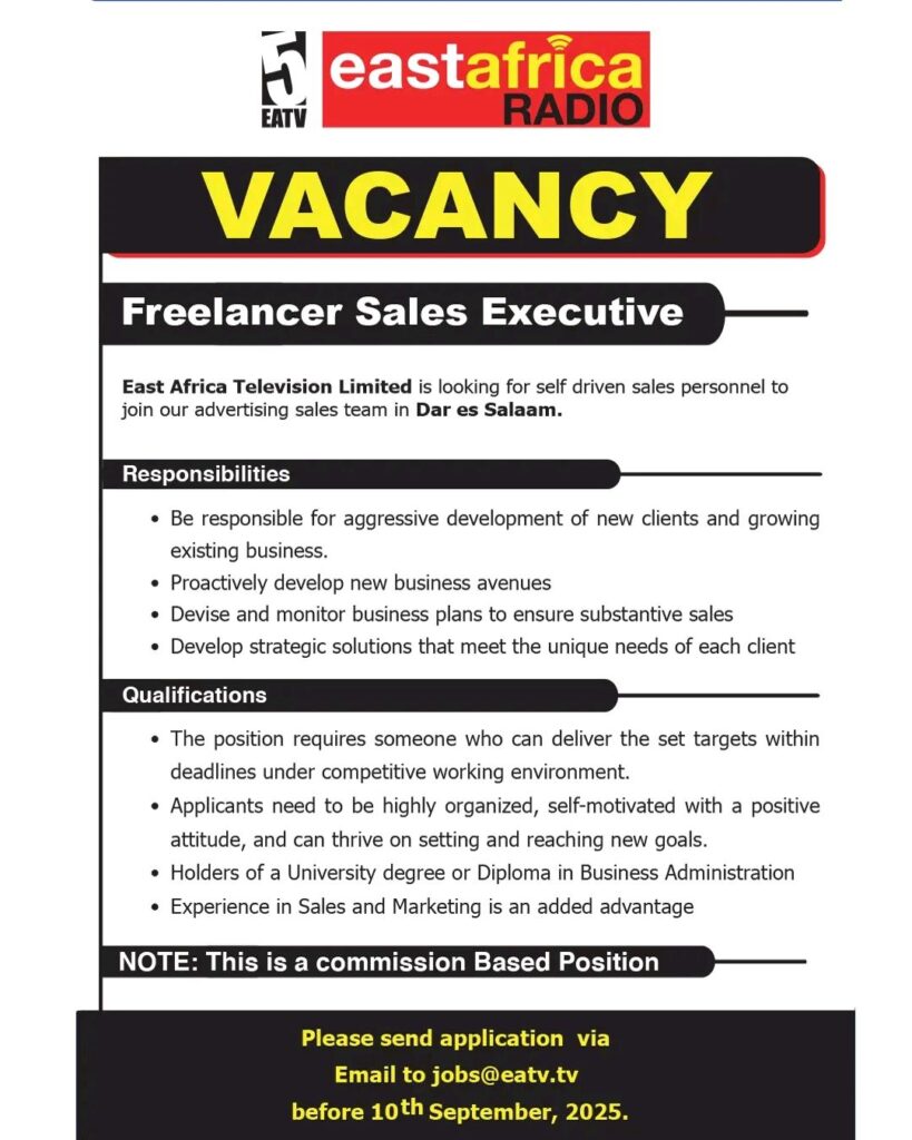 East Africa Television Limited is looking for motivated and self-driven Sales Personnel to join our advertising sales team in Dar es Salaam.