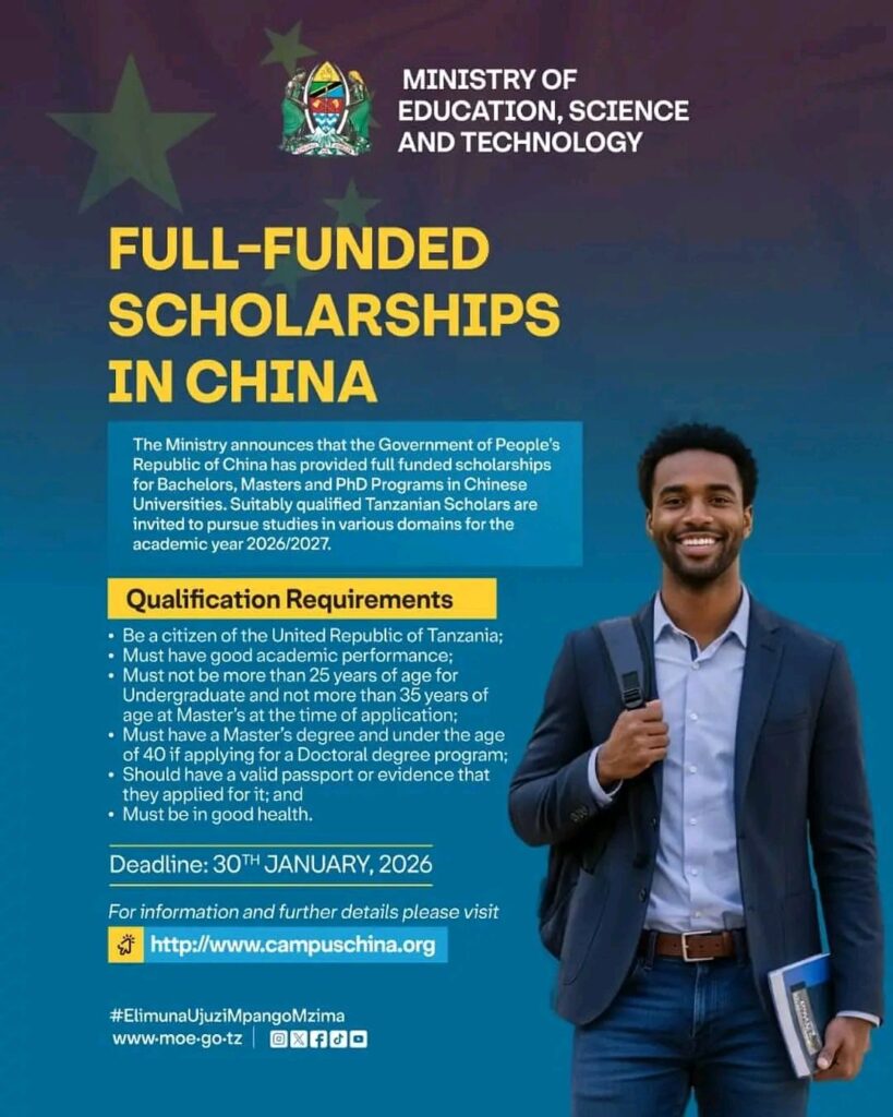 The Ministry announces that the Government of People’s Republic of China has provided full funded scholarships for Bachelors, Masters and PhD Programs in Chinese Universities. Suitably qualified Tanzanian Scholars are invited to pursue studies in various domains for the academic year 2026/2027.