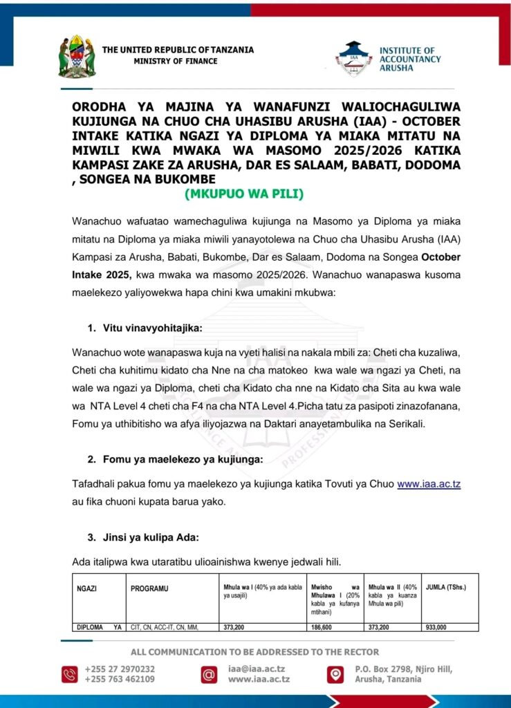 List of Names of Students Selected to join the Academy of Accounting Arusha (IAA) – October Intake at the Three and Two Year Diploma level for the Academic Year 2025/2026 at its Campuses in Arusha, Dar Es Salaam, Babati, Dodoma, Songea and Bukombe Geita.
