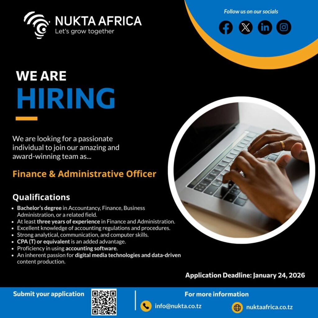 Nukta Africa is looking for a Finance & Administrative Officer to join our creative and award-winning team. Nukta Africa is a Tanzanian digital media and training company specialising on emerging media and communication practices and technologies.