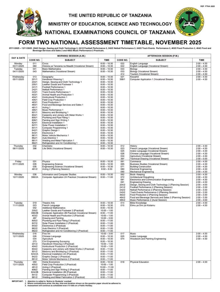 Ratiba ya Upimaji wa Kitaifa wa Kidato cha Pili 2025 (National Examination Timetable for Form Two 2025)