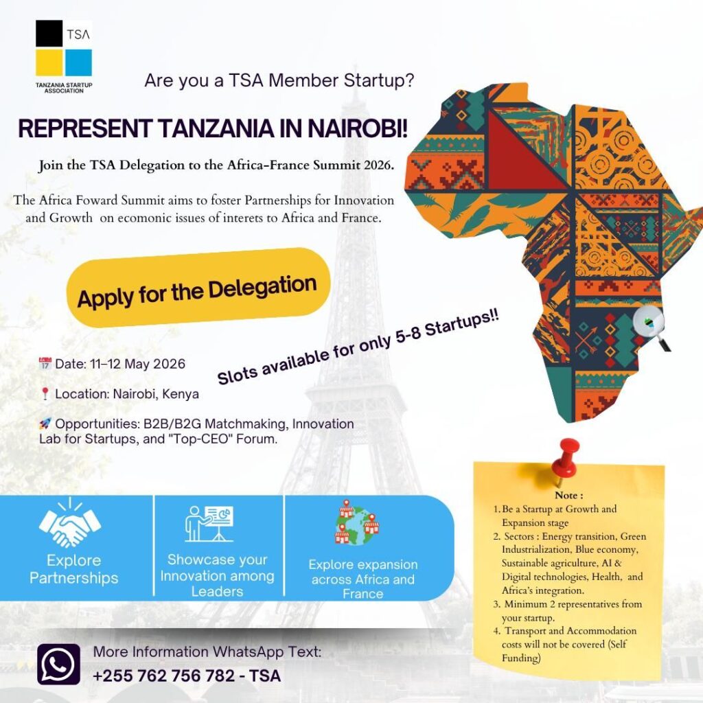 TAKE YOUR STARTUP TO THE NEXT LEVEL! 🇹🇿✈️Are you ready to showcase your innovation on a global stage? TSA is heading to Nairobi for the Africa Forward Summit (May 11-12) with Honorable President Samia Suluh Hassan and Ministry of Foreign Affairs and East Africa Cooperation and we want *YOU* in our delegation! What’s in it for you?📌Innovation Lab: A dedicated space for startups to shine.📌TED-style Talks: Share your story on an international platform.📌Networking: Connect with French and African private sector giants.📌Growth: Explore financing for tech as a catalyst for economic growth. 📌 Market Expansion : Explore Market expansion within Africa and France We are looking for innovators (Startups in Growth stage) in: